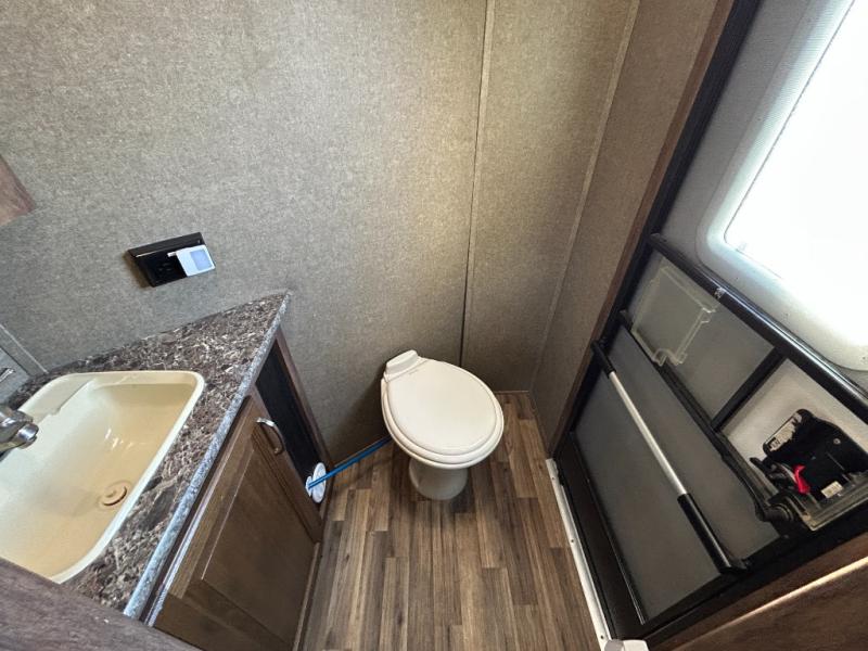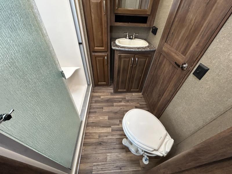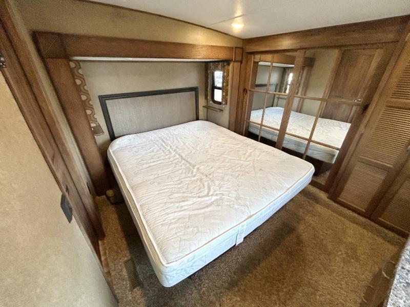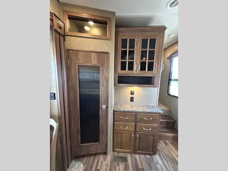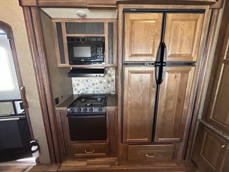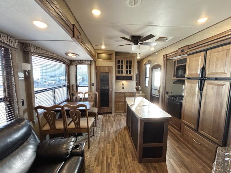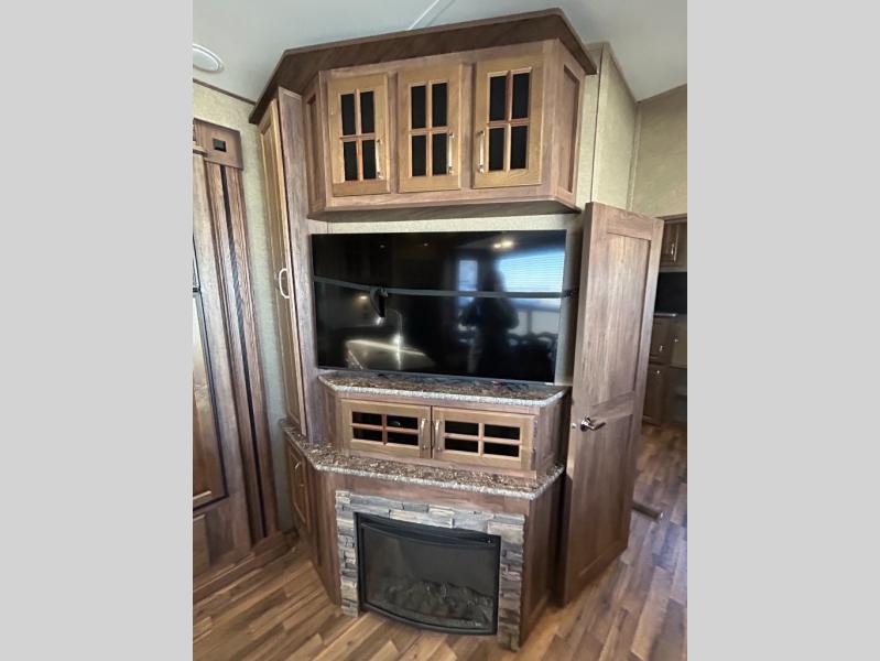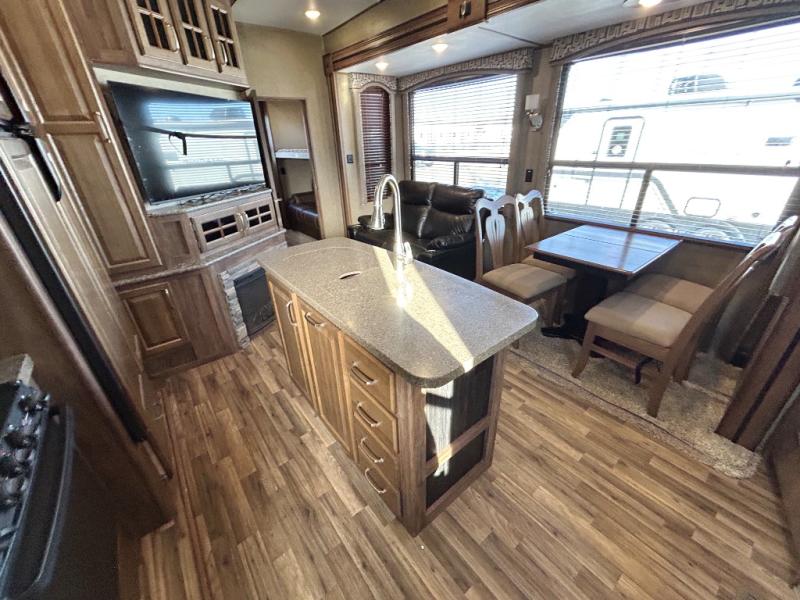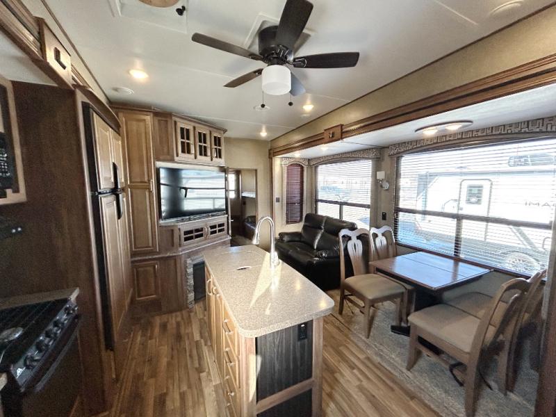 As you enter there are dual opposing slides in the kitchen and living area. The slide to the left has a three burner range, overhead cabinet, and refrigerator. On the opposite side of the fifth wheel you will find that the slide has a free-standing table and four chairs and a tri-fold sofa sleeper. Across from the sofa, on an angle there is an entertainment center with a fireplace. In the middle of the kitchen enjoy the extra work space with a kitchen island including a double sink. There is also a pantry and curio cabinet along the interior wall.