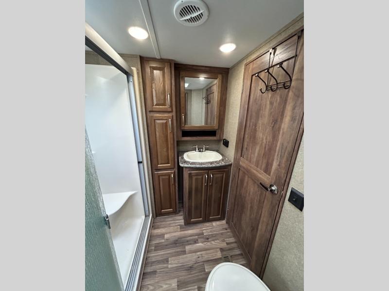 Step up to the bathroom and bedroom area. The bathroom has a shower, linen cabinet for towels or toiletries, sink, and toilet. Plus there is a door into the bedroom.