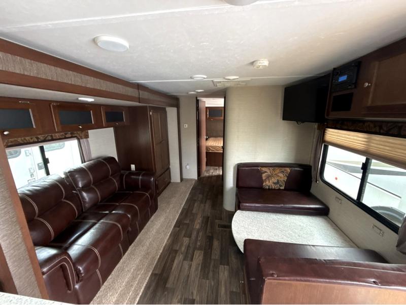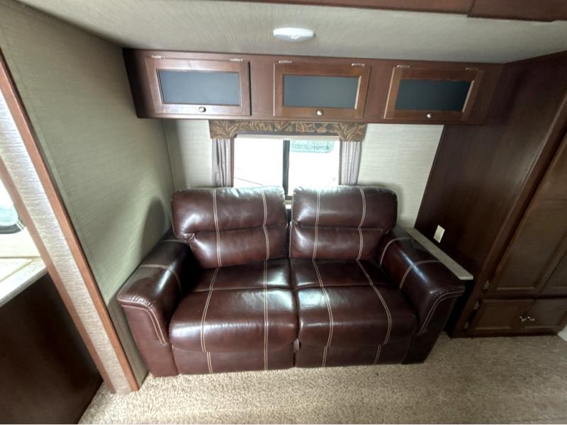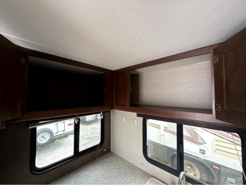 Dine comfortably on the booth dinette just to the right of the entry door. There is also an overhead cabinet for storage plus an LCD TV above for viewing from the sofa across the room.
