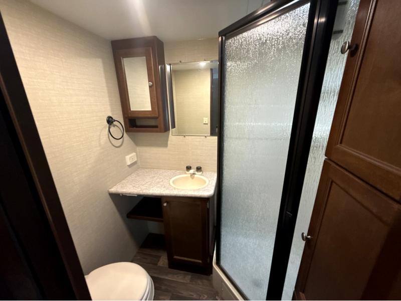 A side aisle bath across from the slide and next to the dinette provides an angled shower, toilet, linen cabinet, and vanity with sink.