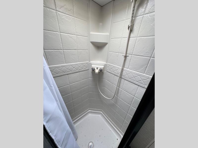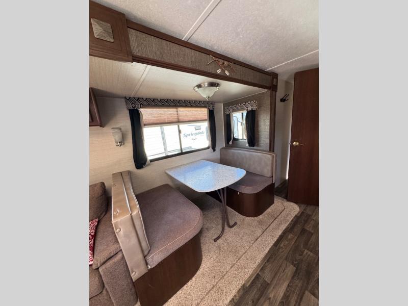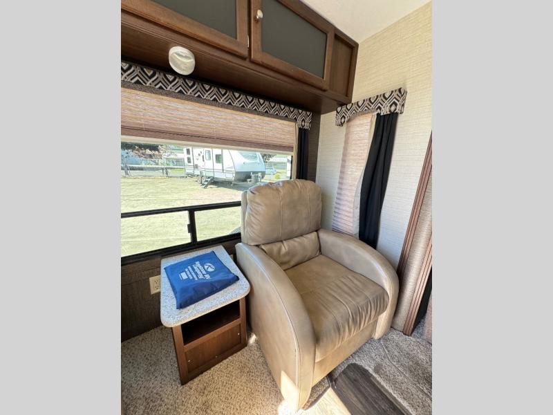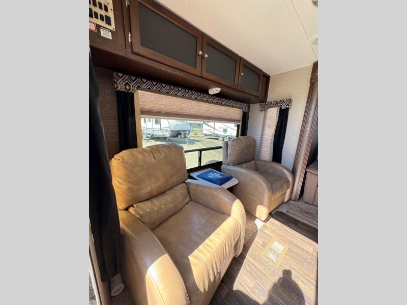 Step inside and find two swivel rockers with an end table between and overhead storage the entire width of the unit. Adjacent to the rockers find a sofa and booth dinette slide. The perfect space for enjoying your meals at, or just relaxing and hanging out.