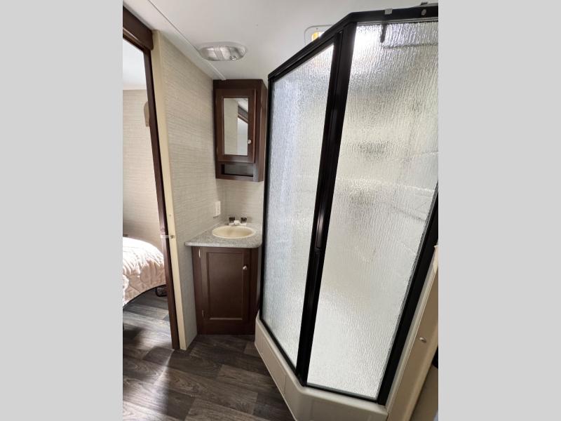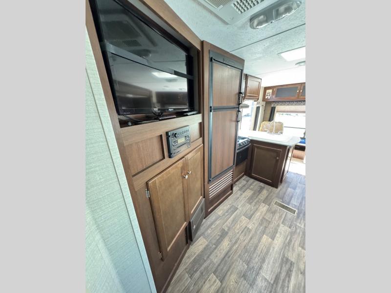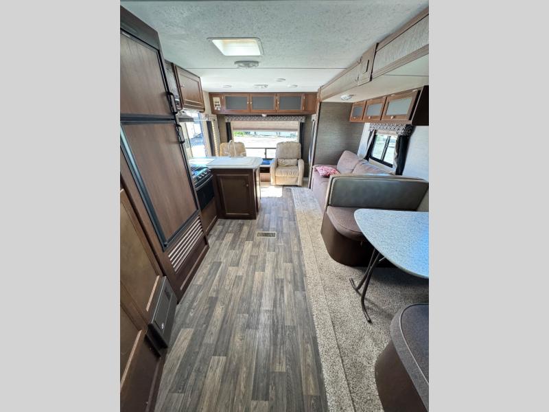 The kitchen is on your right as you step inside model 269RLS and begins with a L-shaped counter and large kitchen sink. There is also a three burner range, refrigerator, and entertainment center with pantry storage that can easily be seen from any seating in the room.