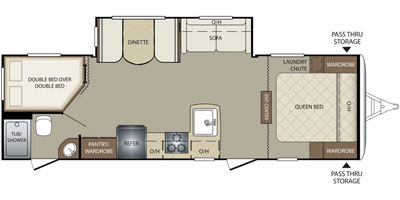 In the rear of 272BHS there is a double bed set of bunks with angled corner and ladder for accessing the top bunk, plus a privacy curtain. The opposite rear corner features a full bath with private entry from outside, and includes a tub/shower, toilet and sink.