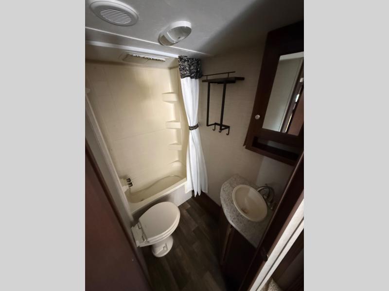In the rear left corner find a set of double size bed bunks, and opposite enjoy the convenience of a full bath with tub/shower, toilet, and sink.
