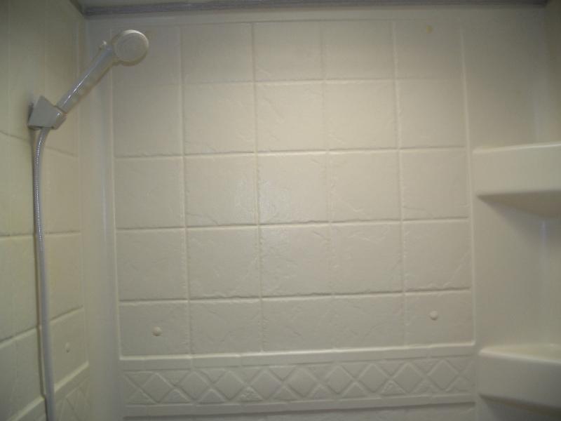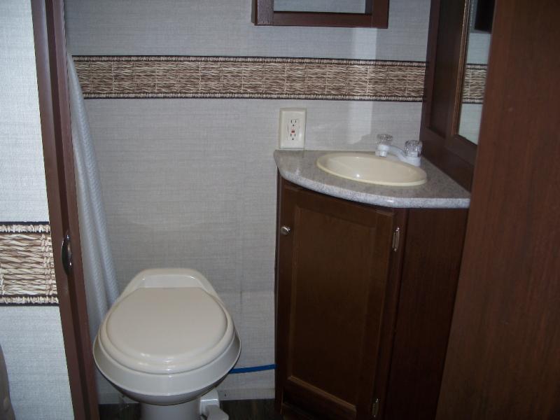 In the rear of the trailer you will find a full bath including a tub/shower, corner sink, toilet, and a wardrobe/linen cabinet.