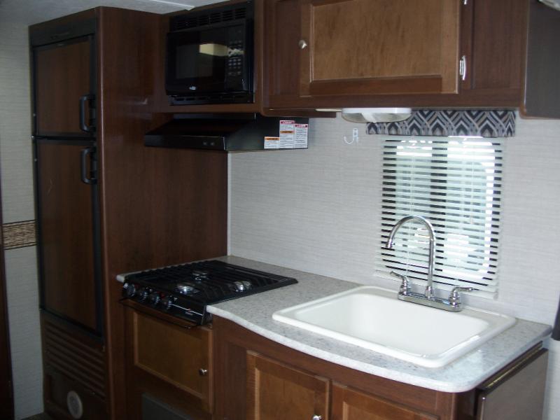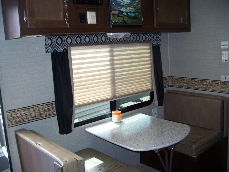 Next you will find a kitchen sink, three burner range, overhead storage, and a refrigerator along the road side. On the opposite side is a dinette with overhead cabinets.