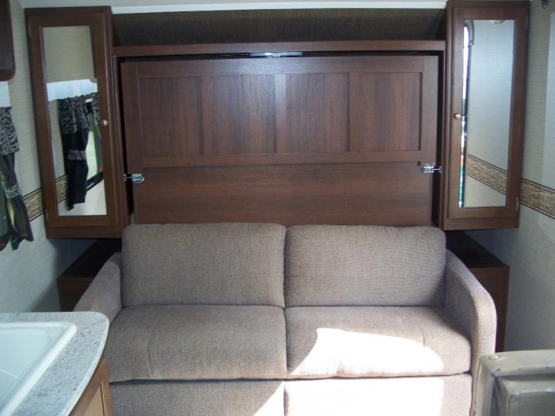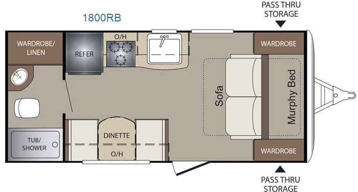 As you step inside model 1800RB to your right is a living room with a sofa during the daytime, and a bedroom with a Murphy bed when it is bedtime. Plus there is a wardrobe on each side of the bed.