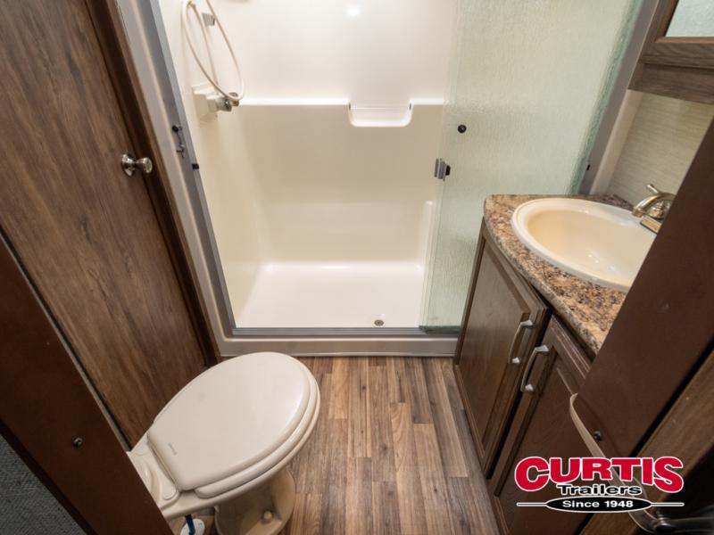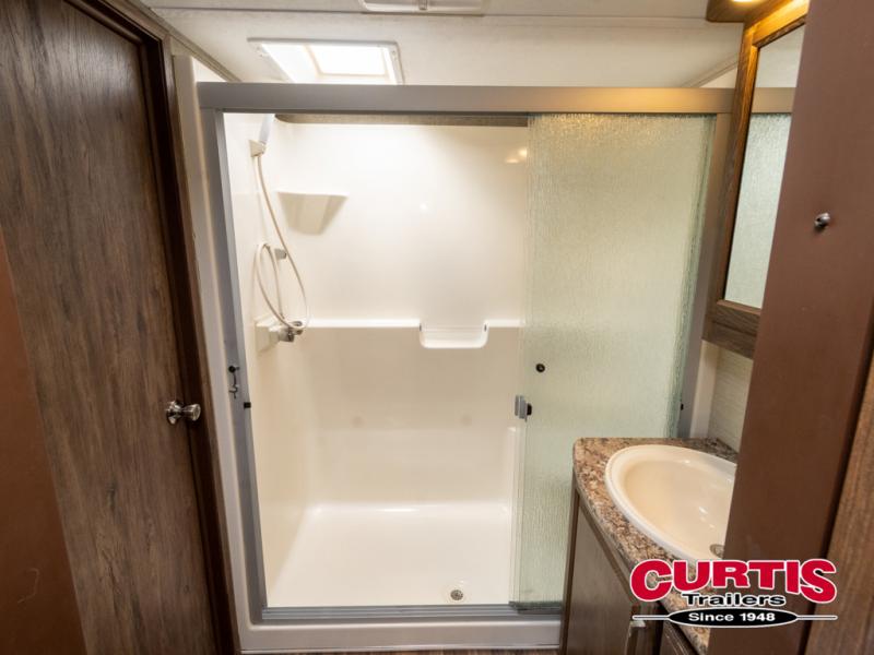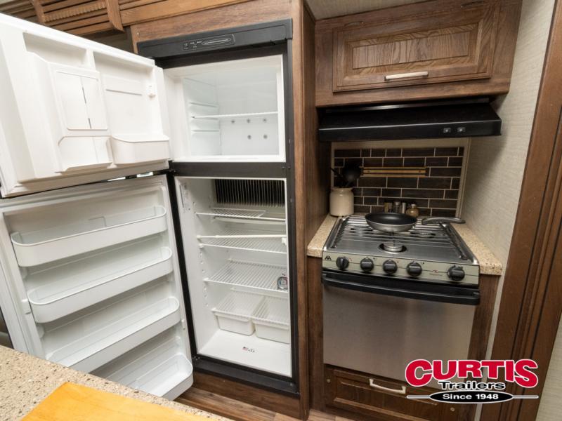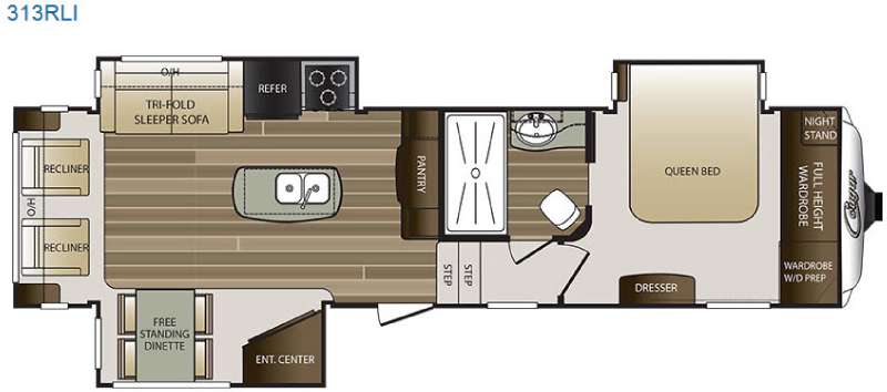 Just inside the entry door you will see how spacious and open the combined living and kitchen area is. There is a slide out entertainment center and free standing dinette to your immediate left. There are two reclining chairs along the rear wall with an end table between and overhead storage also. The second slide features a tri-fold sleeper sofa, refrigerator, and three burner range. There is also a pantry off to the side, plus more counter and cabinet space for storage.