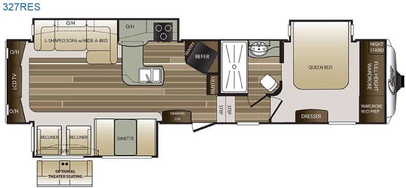 The slide opposite the door also features an L-shaped sofa with hide-a-bed including overhead storage along with the kitchen appliances. The slide to the left inside the door just beyond the entry closet features a booth dinette and two recliners with overhead storage. You can choose optional theater seating for two in place of the recliners if you like.