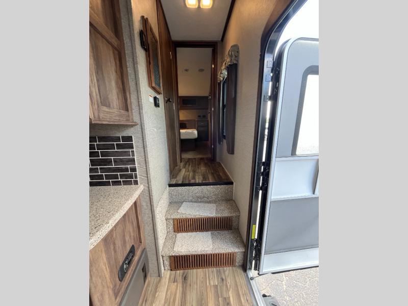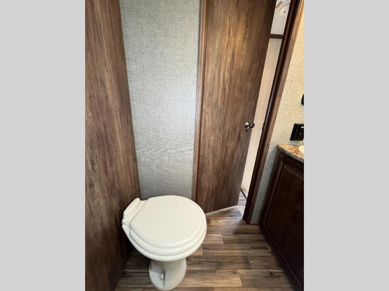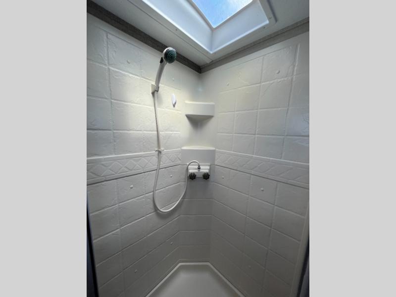 Head up the steps in front to a side aisle bath and front bedroom. The bathroom features a neo-angled shower, sink, and toilet, plus a slide out linen cabinet that is found along with the bedroom wardrobe slide.