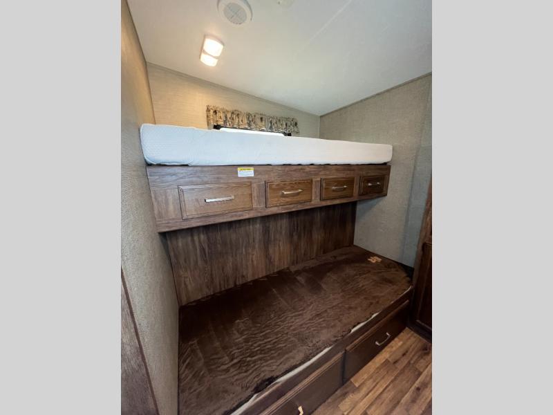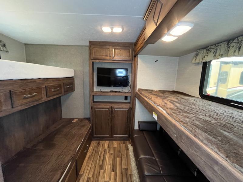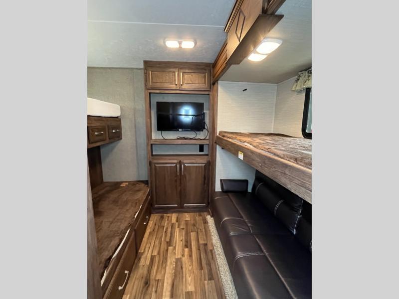 Back through the main living space head to the rear which is where you will most likely find the kids hanging out. There is a slide out jack knife with flip-up bunk above on the right, and a set of bunks on the left. Straight ahead through the bunkhouse door you will see an entertainment center with 32" TV. There is also a wardrobe just inside the door on your left for storage needs, as well as drawers beneath the bunks, and beneath the TV area too.