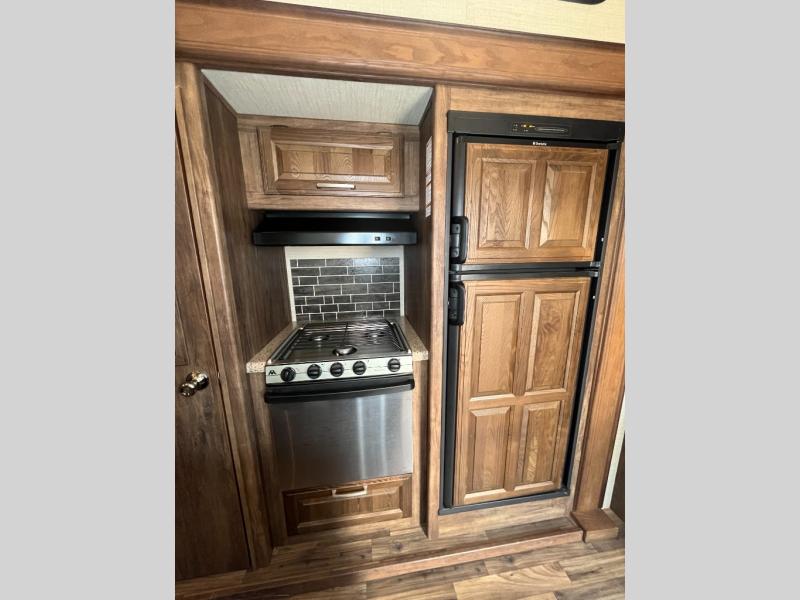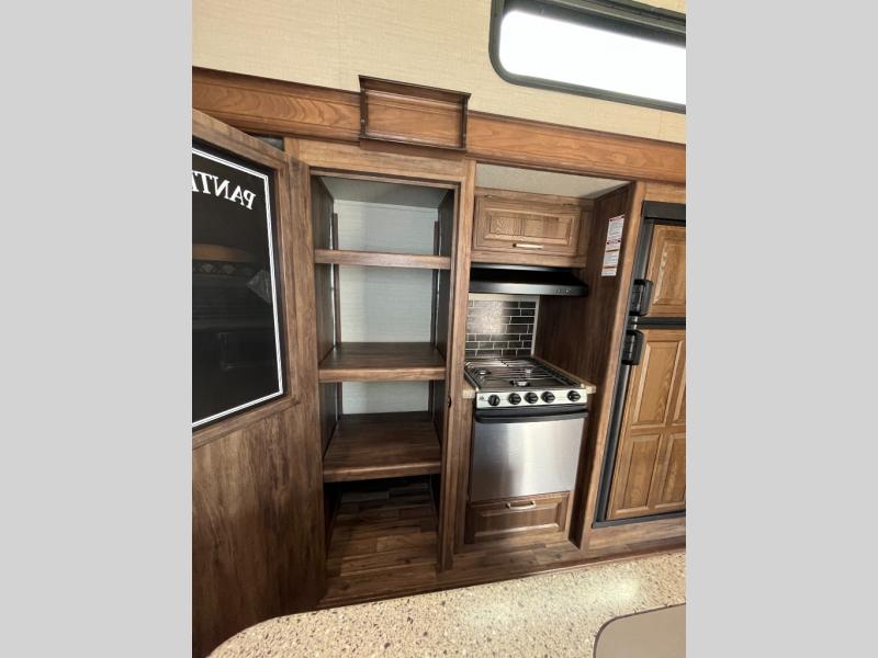 Step inside and see a wide open space with storage straight ahead. There are overhead cabinets, plus lower cupboards as well as a counter space. In the center find an island with more food prep space plus the location of the double kitchen sink. Behind it, find a refrigerator, three burner range with overhead microwave oven, and walk-in pantry with decorative glass top door. This all slides out along with a living area entertainment center including a 40" TV, plus overhead storage, and optional fireplace below.