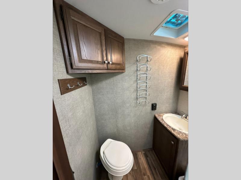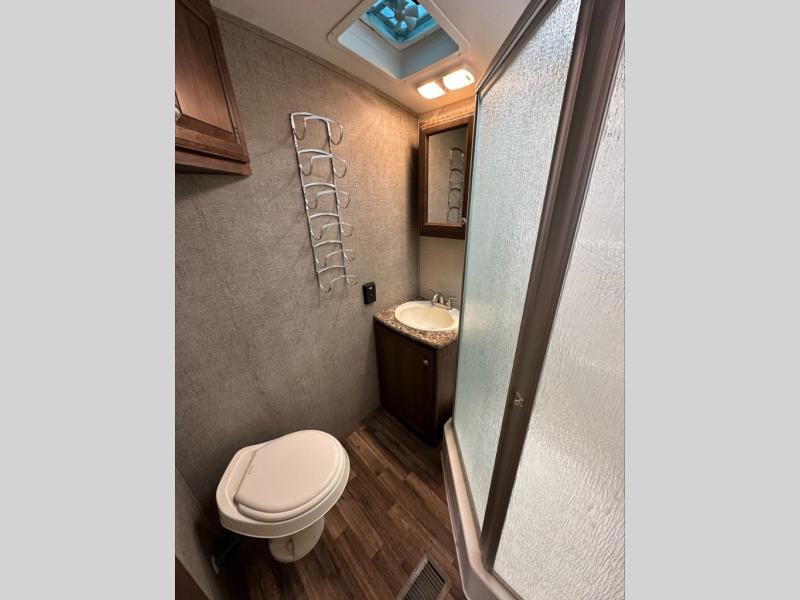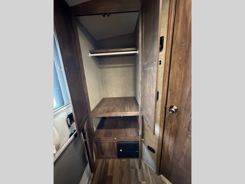 Opposite the door side is a second slide out featuring a pantry for dry and canned food storage needs, and a booth dinette for seating. The dinette features overhead storage, and it can easily be transformed into additional sleeping space if needed at night. A nearby entertainment center is available for you to enjoy as well.