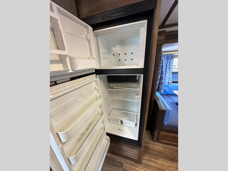To the right of the entry door is where you will enjoy cooking up meals and snacks for your family. There is a slide out counter area, three burner range, and refrigerator. The kitchen island is where you will find the double sink and more counter space.