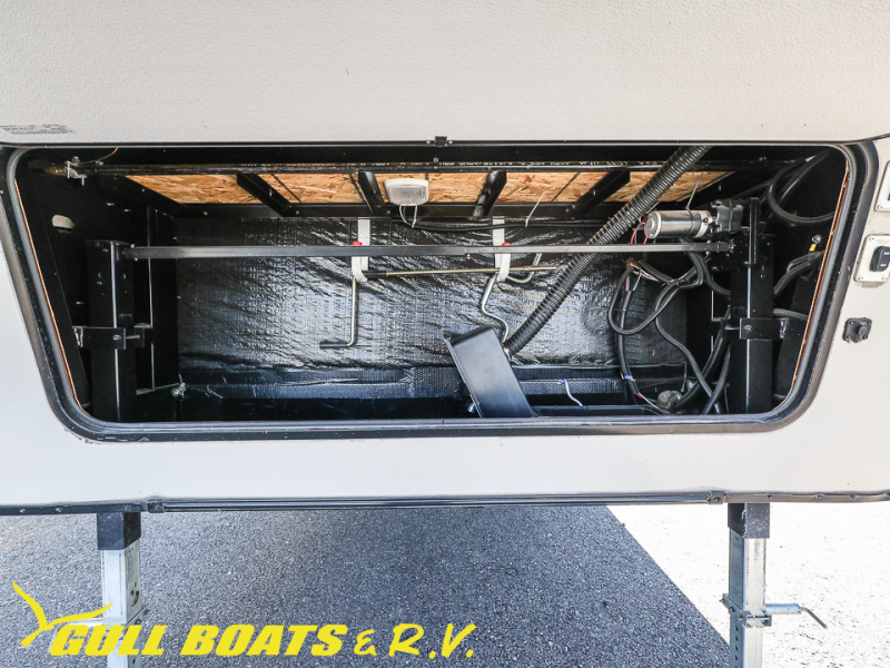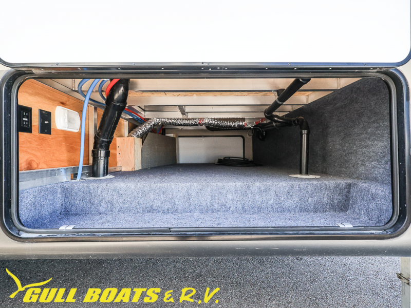 In front take a step up to the master suite featuring a convenient laundry chute at the top. There is a private toilet area on the right with a vanity and sink just around the corner. A neo-angle shower can be found on the left next to a linen cabinet with space for a TV on top. There is a queen bed with overhead storage in the center of the front wall with a wardrobe on one side and nightstand opposite. Enjoy overhead storage above the bed for all of your storage needs, and so much more!