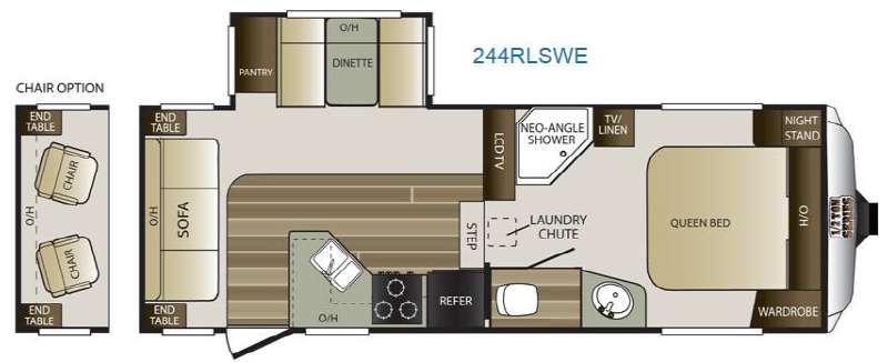 As you step inside model 244RLSWE you will find a rear sofa with overhead storage, plus end tables on either side. You can also choose the optional rocker recliners instead of the sofa still retaining the storage above, as well as the end tables.