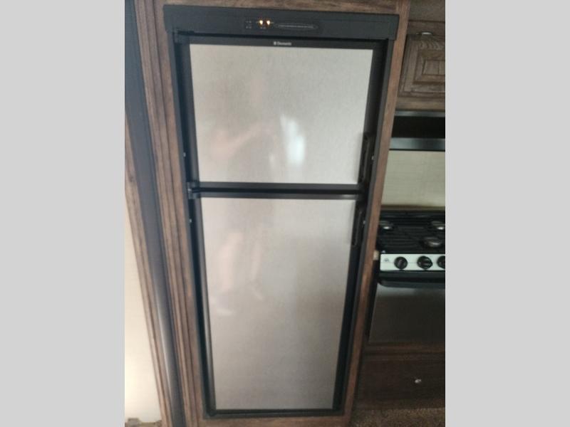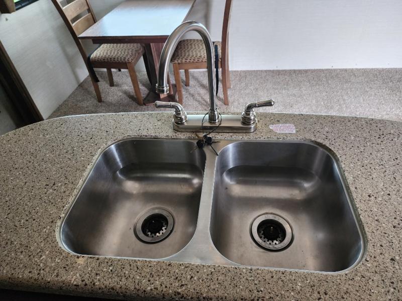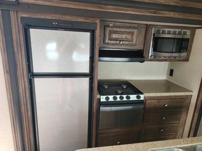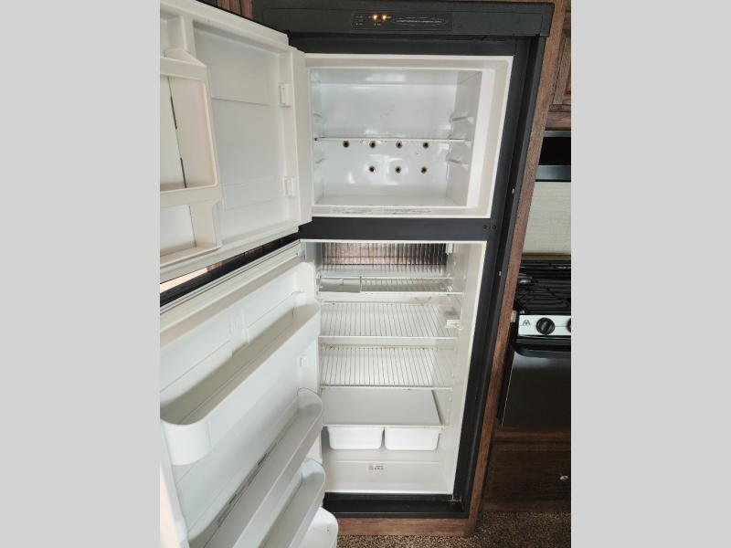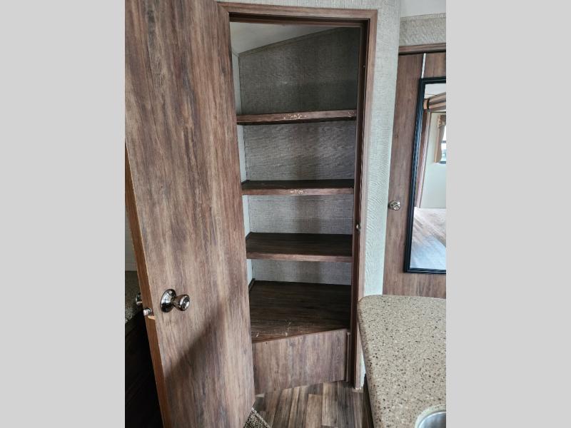 The kitchen is found to the left of the main entry door and features a slide out refrigerator, three burner range, and counter with overhead storage. The island off center features a large sink, and added counter space. There is a large pantry just off the slide for all of your food storage needs.