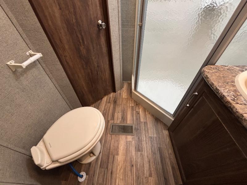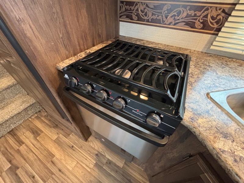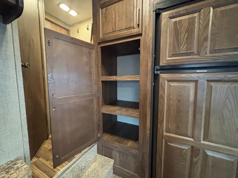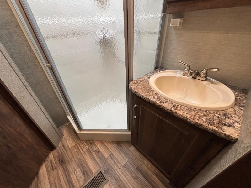 Model 277RLSWE offers a rear living layout with two push-back recliners including an end table between. There are overhead cabinets above also. As you continue into the space there is a sofa and spacious u-shaped dinette perfect for mealtime seating for everyone. Enjoy the entertainment center that is ready with TV hook-ups for you to add an optional 32" flat screen TV.