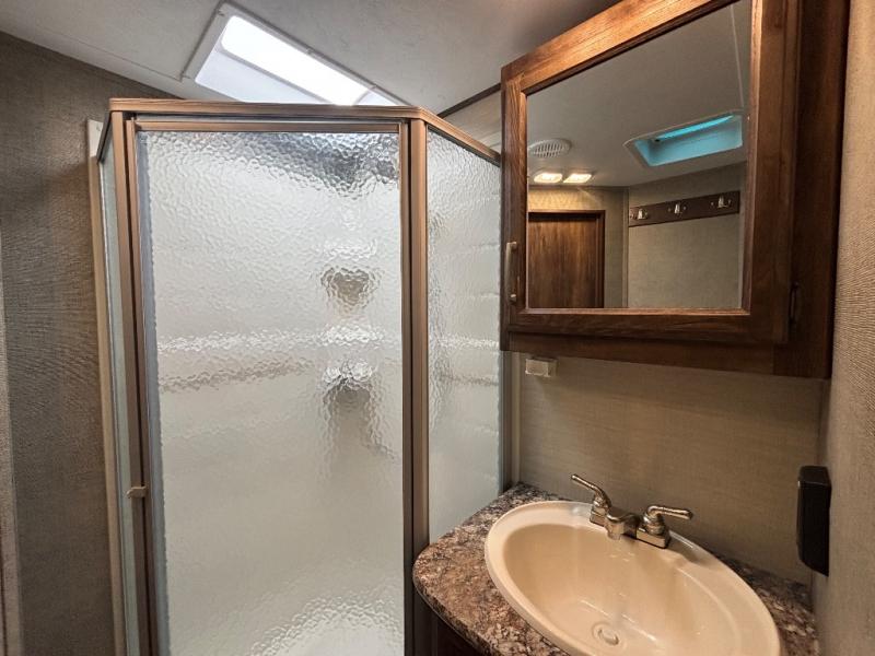 Step up to a side aisle bath and front bedroom. Notice the corner linen cabinet as you reach the top step in the hall. Inside the bath find a neo-angled shower, sink, and toilet. The bath also offers a second door that slides for convenience when in the front master suite.
