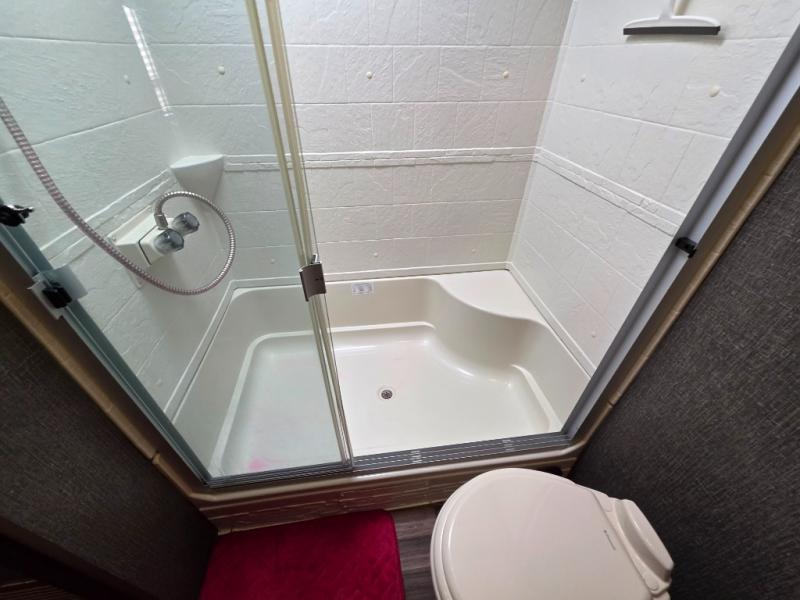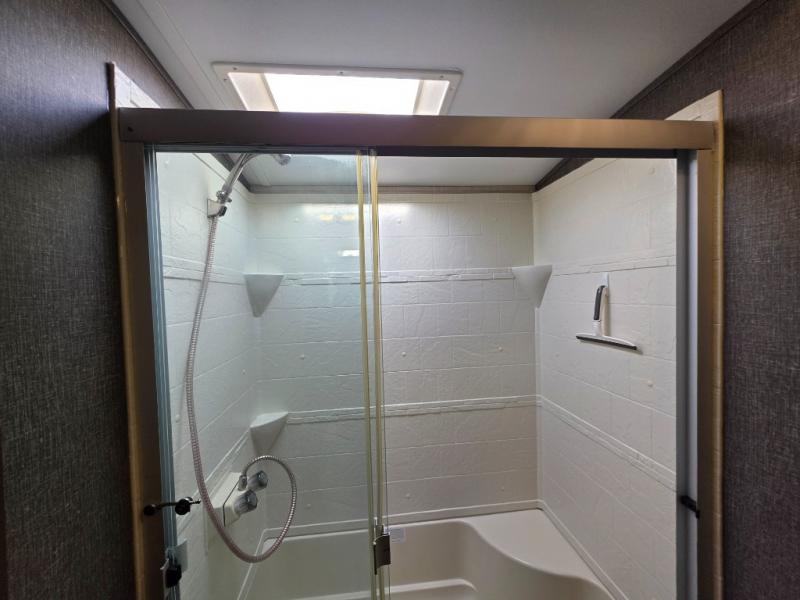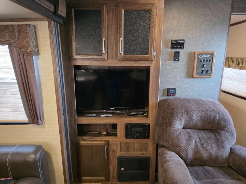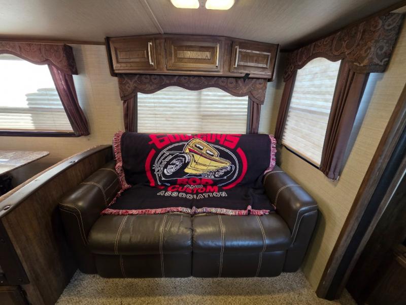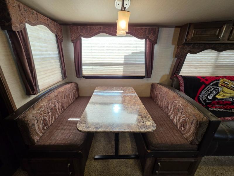 Back in the main living area find an entertainment center along the interior wall. This can easily be viewed from the slide out tri-fold sleeper sofa and booth dinette. The dinette is great for enjoying your meals at, and also can be made into sleeping space for an extra guest just like the sofa.