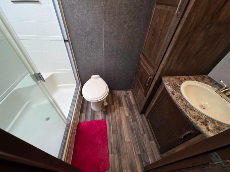 The rear of this Cougar X-Lite model 26RBI offers a full rear bath with a shower, toilet, linen cabinet, and vanity with sink.