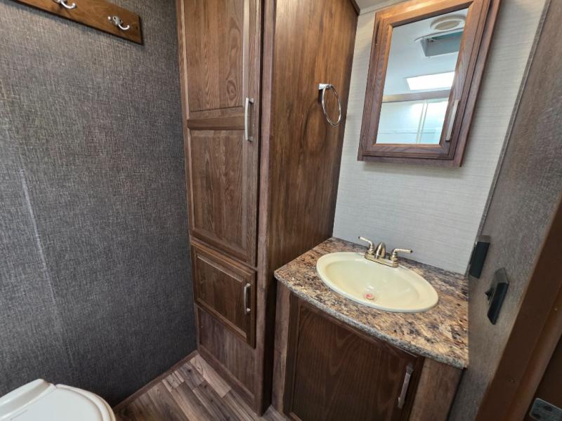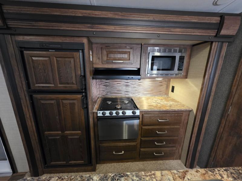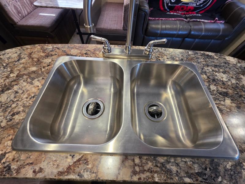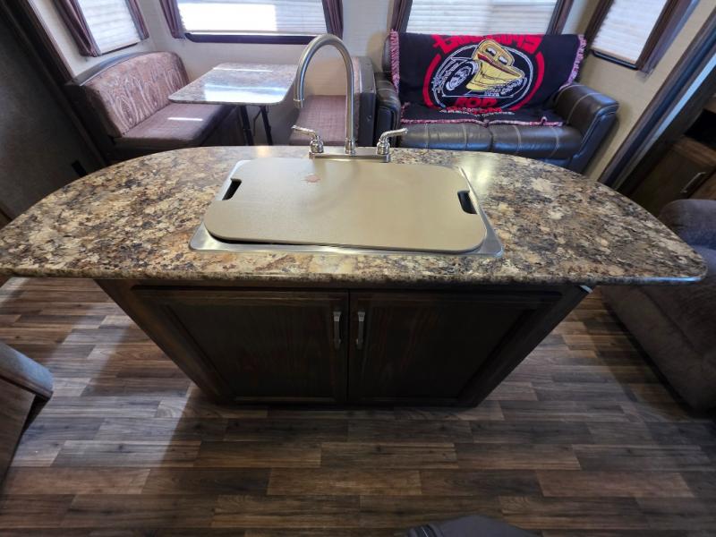 On the door side find to your left a kitchen slide out that includes a refrigerator, three burner range, plus counter and overhead storage space, as well as lower cupboards too. An adjacent pantry is large enough to store all of your extra things, and the convenient kitchen island features plenty of extra prep space, plus a large kitchen sink.