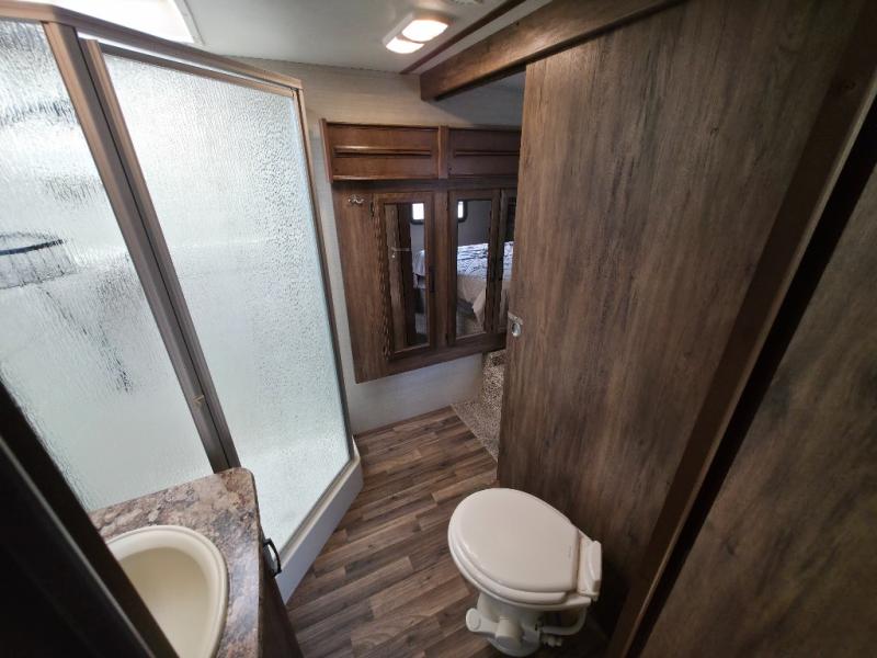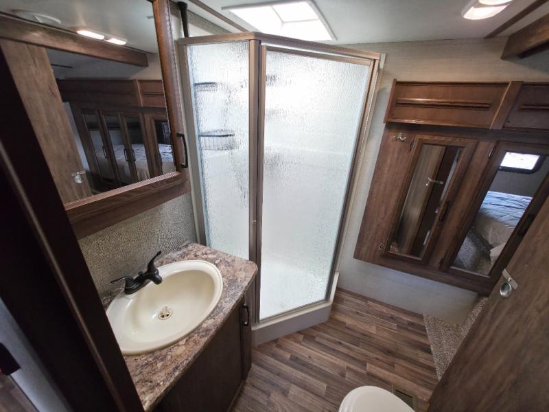 Heading towards the front of the fifth wheel, take one step up to the side aisle bath on your left. There is a neo-angle shower, sink, toilet, and linen cabinet that is part of the wardrobe slide in the bedroom, plus a second entry into the bedroom from the bath.