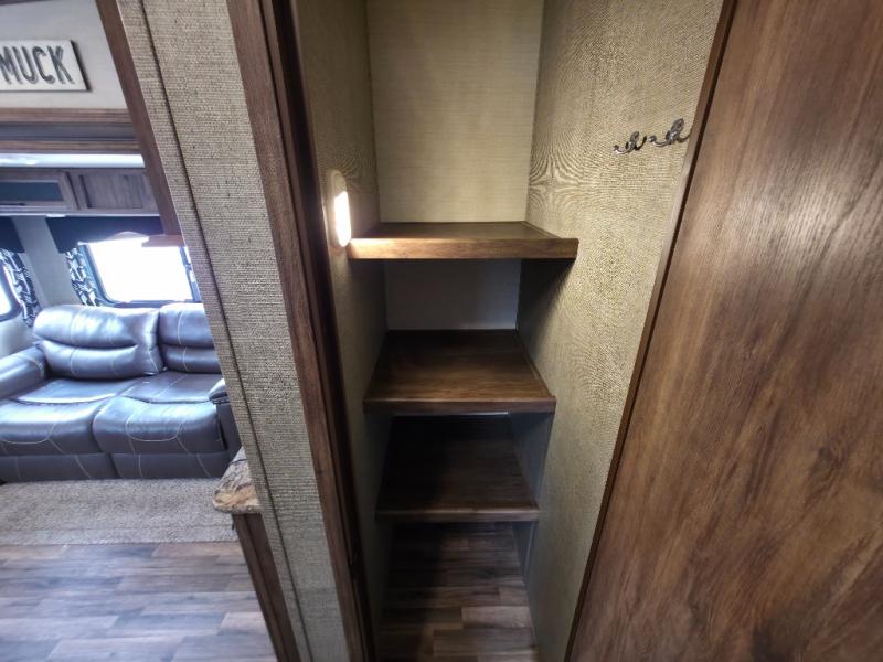 The bedroom features a queen size bed with a nightstand and wardrobe. There is also an overhead cabinet for keeping things organized. There is a TV when you want to relax and watch your favorite shows. You will also find a slide out wardrobe/linen cabinet on the road side wall making more floor space in this master bedroom.