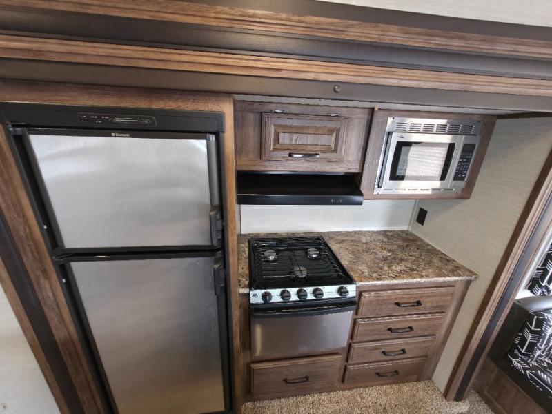 Straight in from the entry door find a walk-in pantry that you are sure to love storing your non-perishables plus some. To the left of the entry door you will find the kitchen amenities. There is a refrigerator, three burner range, countertop space, and overhead cabinets within the slide. You will enjoy the kitchen island with a large single sink when it is time to clean up the dishes.