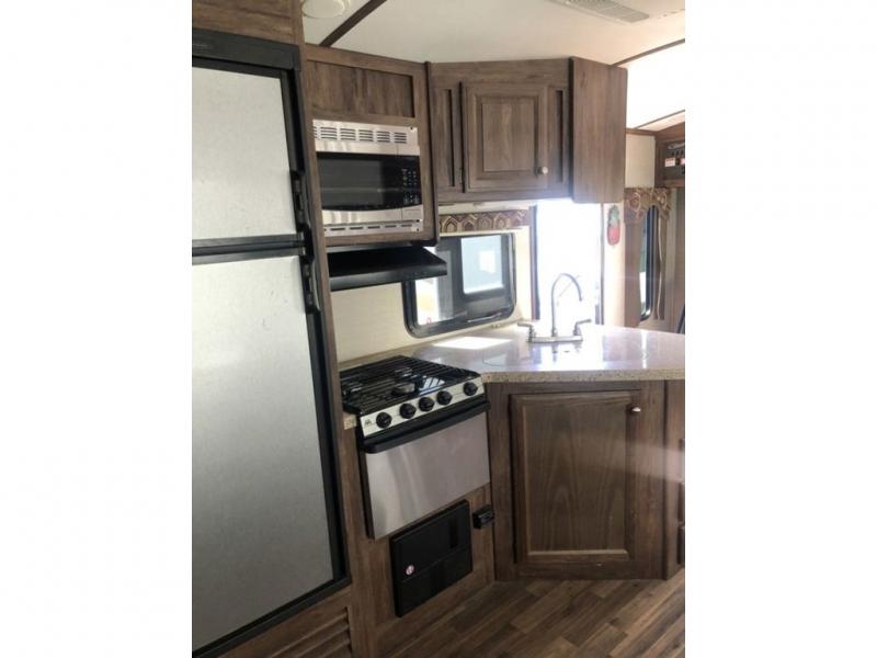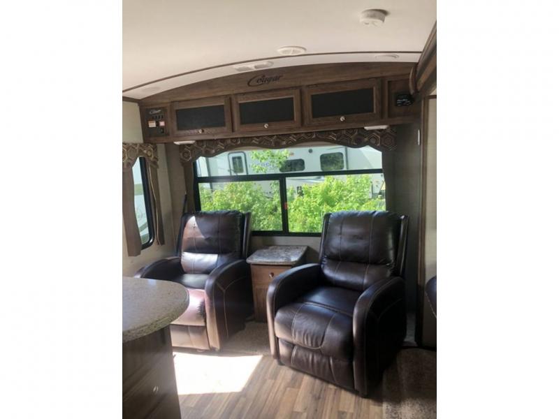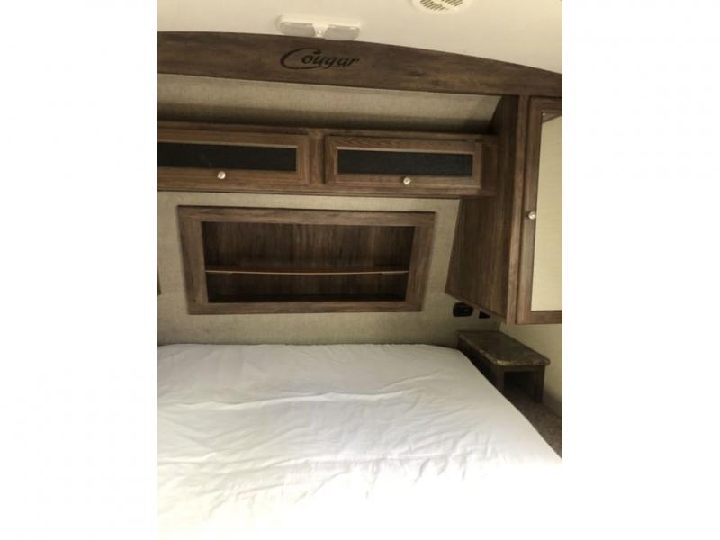 This rear living Cougar X-Lite travel trailer 28RLS by Keystone offers plenty of space with a large slide, and many comforts of home.