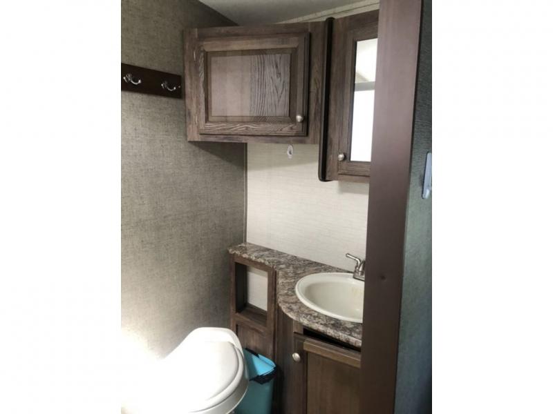 As you step inside you are greeted with an inviting living area including two recliners with an end table and overhead storage space. There is a tri-fold sleeper sofa and booth dinette slide out for plenty of seating during mealtimes and just hanging out. Plus, both can be quickly converted to sleeping space for family or guests. A nearby entertainment center can be easily viewed from anywhere in the room.