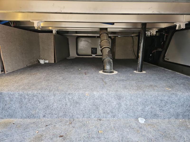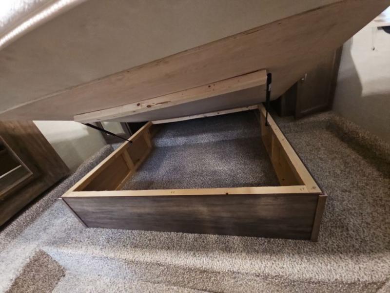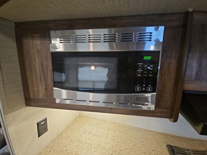 Opposite within the kitchen amenities slide is a L-shaped sofa with storage above. Seated here you can easily enjoy conversation with family and friends, and also enjoy watching your favorite movies or television on the rear entertainment center that stretches across the entire width of the unit.