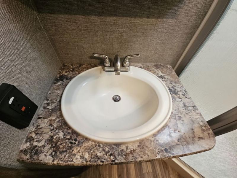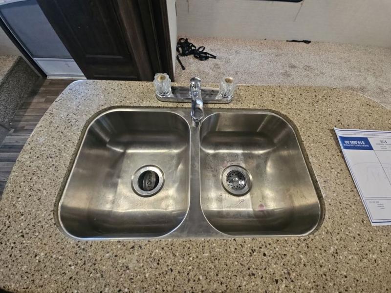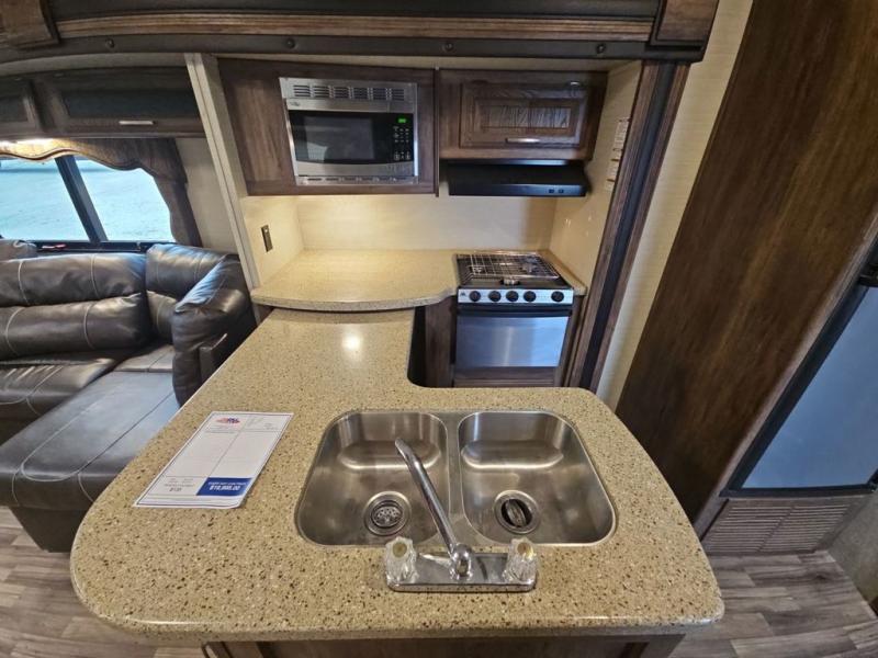 Step inside and find yourself in the kitchen where you can comfortably prepare and cook all of your favorite foods. There is a refrigerator straight ahead, a pantry to the left of the entry door, and a L-shaped counter with a double sink, and three burner range that is all part of the road side slide out. You will also find plenty of overhead cabinets for storing dishes and things as well.