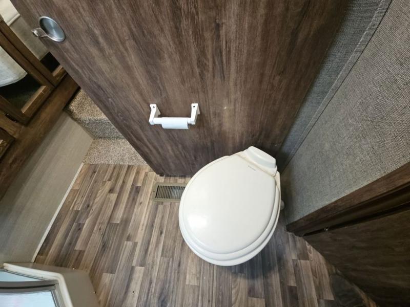 To the left of the entrance just beyond the pantry find a booth dinette to enjoy your meals at, and two recliners with overhead storage in a slide out creating a bit more walking around space for everyone. You can even choose optional theater seating in place of the recliners.