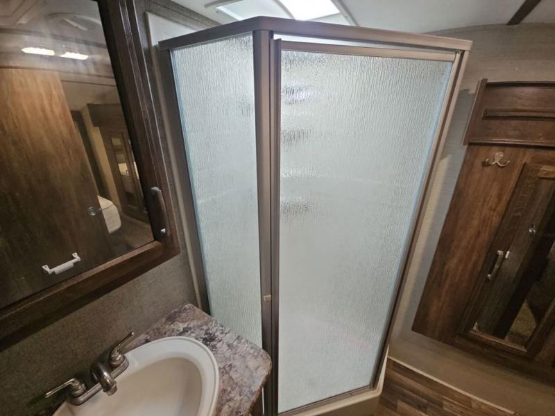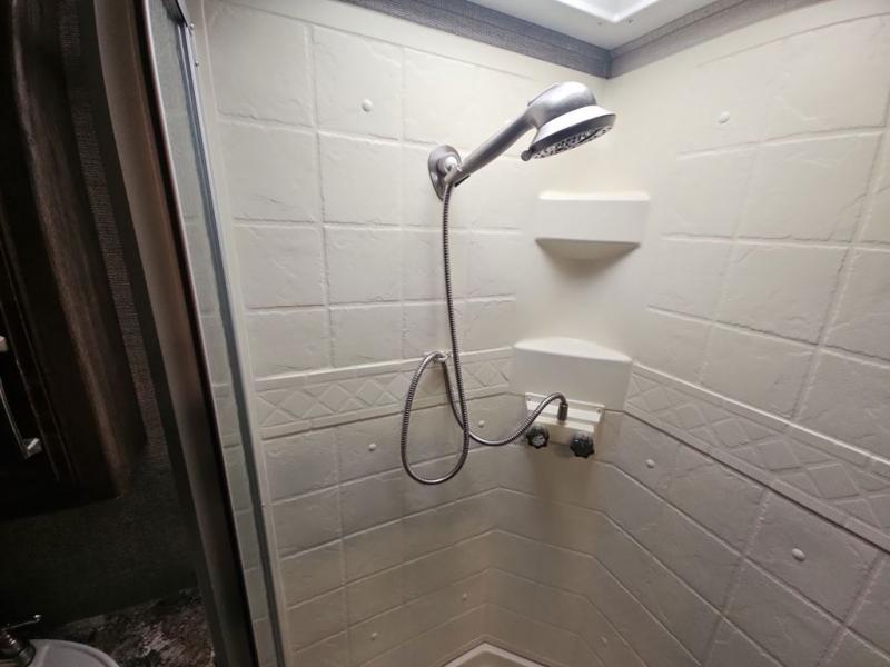 Back up front to the right of the main entry head up the step to a side bath and front master suite. The bathroom offers a neo-angle shower, toilet, and a sink. Plus with the second entry door that leads into the master you can easily access the linen cabinet that is attached to the bedroom wardrobe slide out.