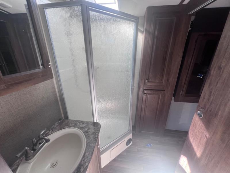 If you are looking for the restroom then head towards the front of the trailer. The side isle bath includes a neo-angle shower, sink, toilet, and linen cabinet, plus a second entry into the bath from the bedroom.