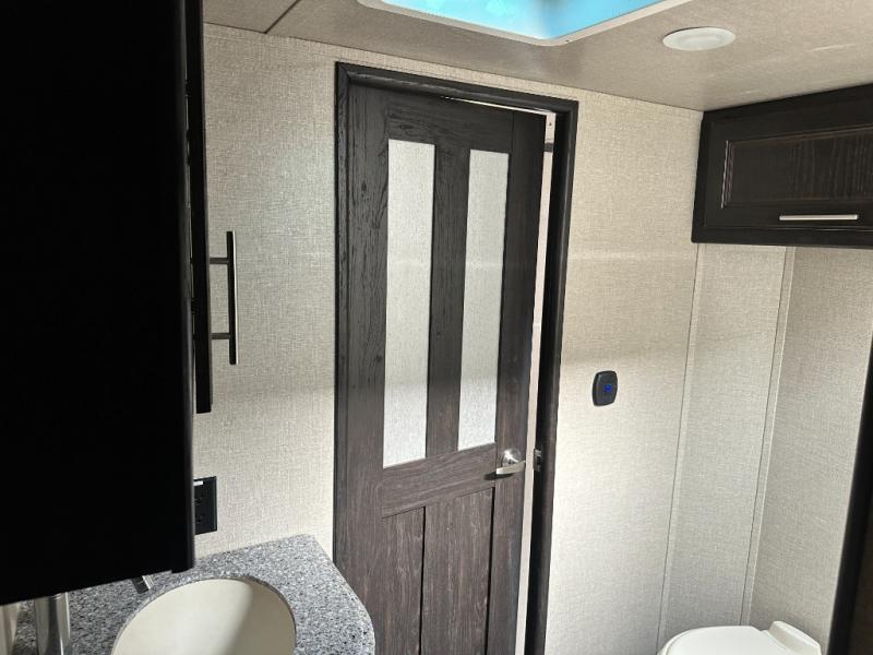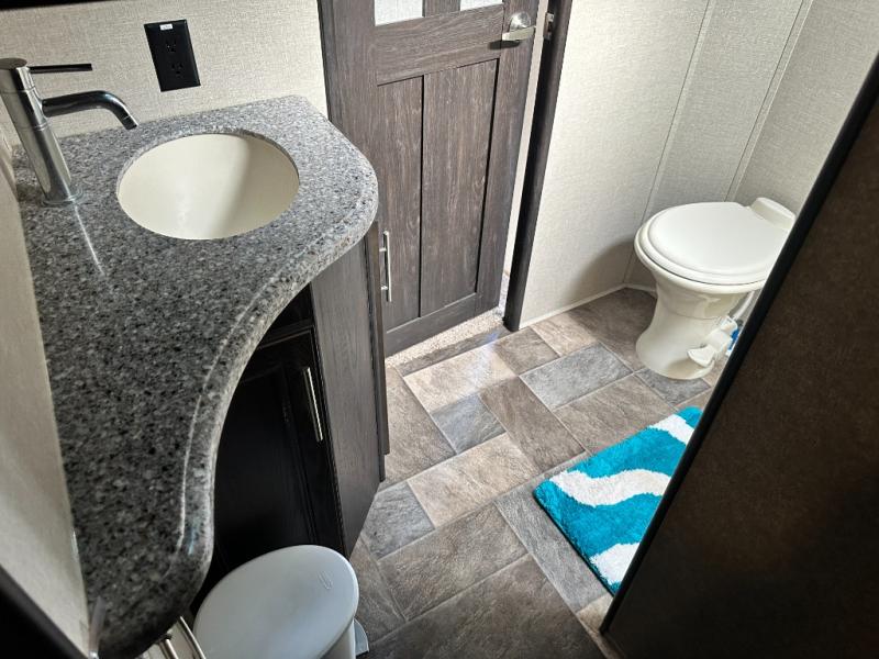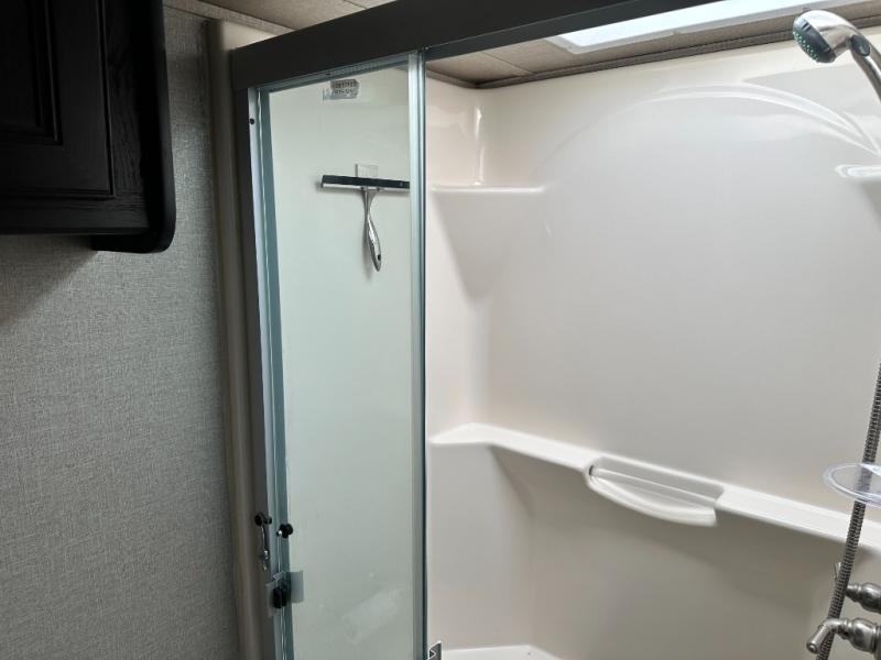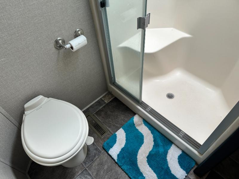 Head up the steps to the front bed and side aisle bath at the top of the stairs. The bath offers a residential shower with door, a toilet, and vanity with sink. Because of a second sliding door that leads into the front bedroom you will find easy access to the slide out linen cabinet that is part of the bedroom wardrobe slide out.