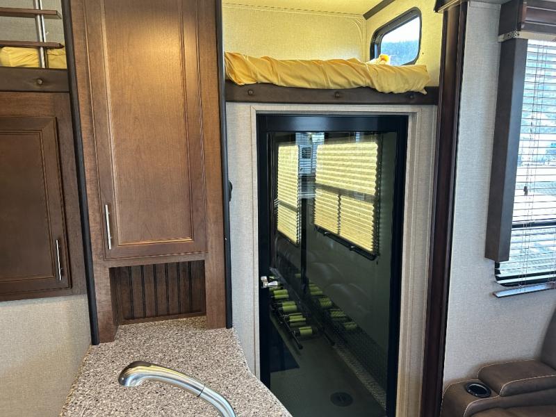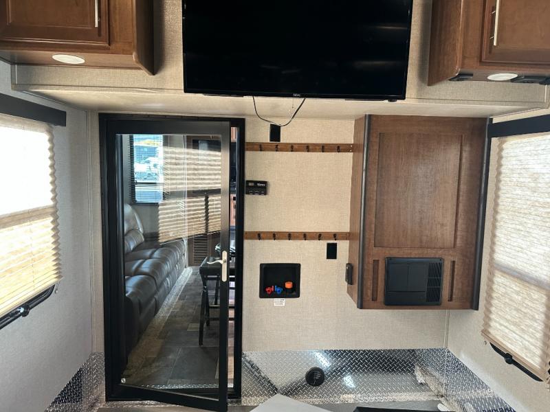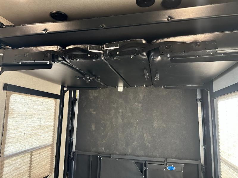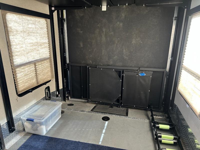 Enter the cargo by the rear ramp door and see just how easy it will be to load up your toys and gear. Know everything is super secure with the Fuzion 5K Inter-Lock tie down system. The cargo features its own side man door for easy access once the rear ramp door is closed, and the overhead loft provides added sleeping for one of your guests. There is also a dual opposing sofa with a top queen bed that stores neatly up at the ceiling when not in use during the day.