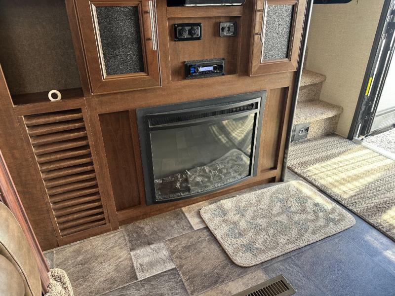 Enter the main living space and find a large slide out sofa. There is also a 48" LED HD TV and fireplace along the interior living room wall.
