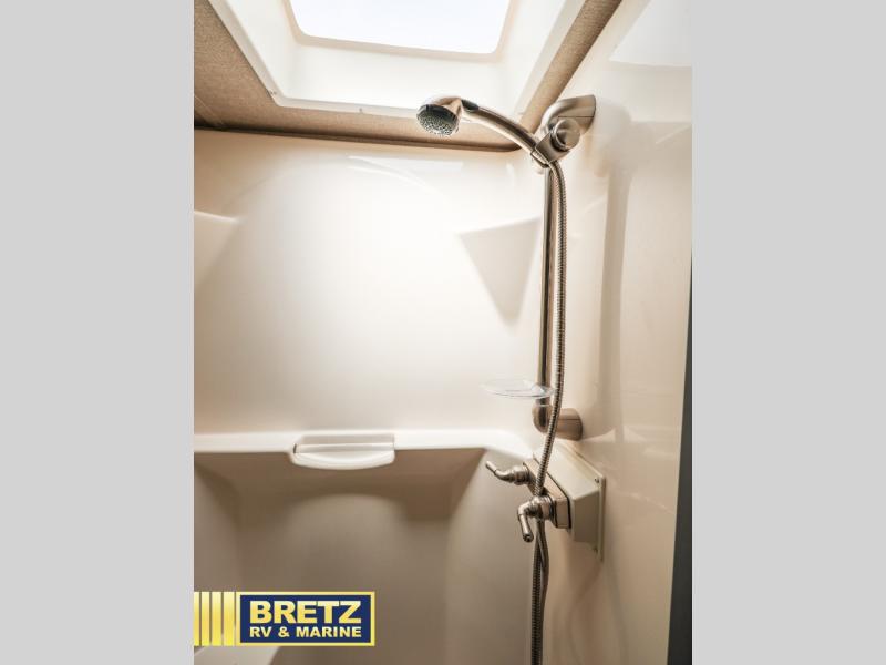 Head up the steps to the right and find a side aisle bath with residential shower, toilet, and vanity with sink. There is a second bathroom entry door that allows you access to the bedroom and the linen/wardrobe slide out.