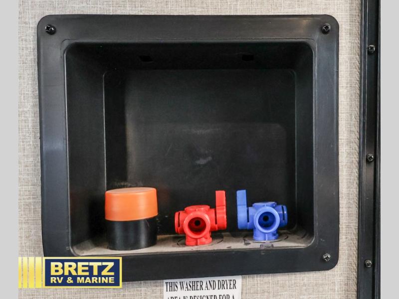Head into the main living space from the cargo area or from the main side entry door. Inside you will enjoy a spacious combined living room and kitchen area with large slide out sofa to the left as you enter. Straight inside there is a counter with overhead cabinets along the interior wall, and a slide out pantry, three burner range, plus 18 cu. ft. refrigerator to make it easy to prepare and cook food.