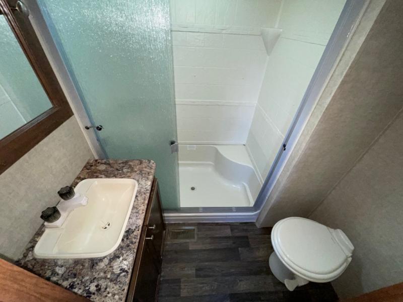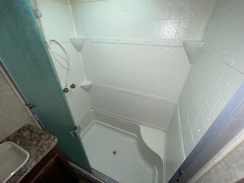 Back toward the front there is a step up to a side aisle bath and front bedroom. The bath features a 30" x 50" shower, toilet and sink.