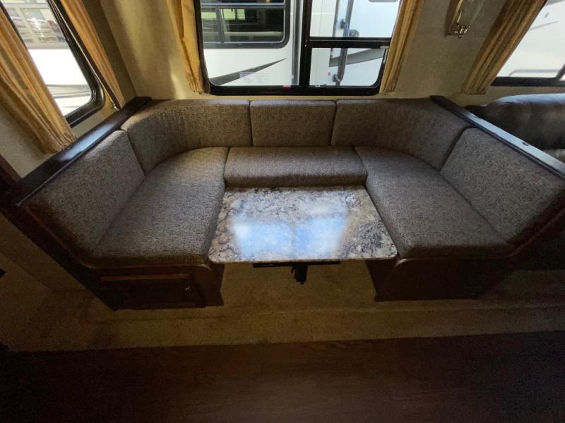 On the opposite side there is a slide that features a u-shaped dinette and tri-fold sofa with overhead storage above. An entertainment center featuring a 32" TV is located along the interior living room wall and can easily be viewed from anywhere in the room.