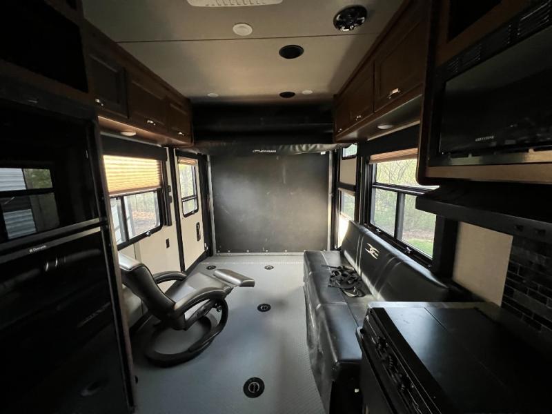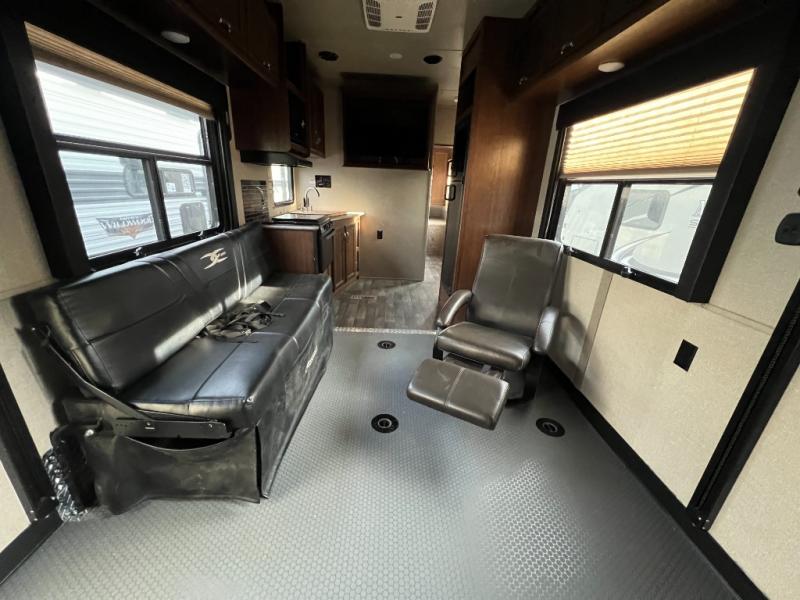 The rear 8' garage door will make loading and unloading a cinch. There is a single electric lift bed/combo couch in the rear for more seating and sleeping space once the cargo is removed. There is also a sofa/bed with overhead cabinet and dinette table for use at mealtimes too.