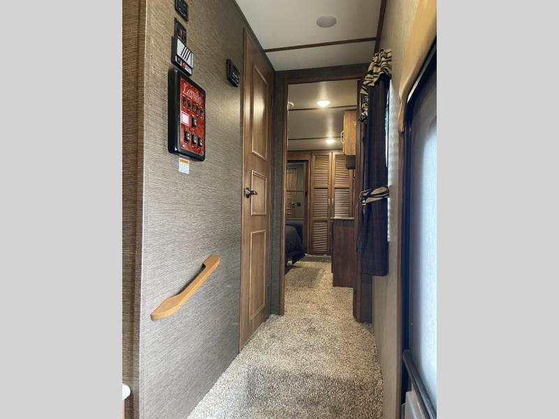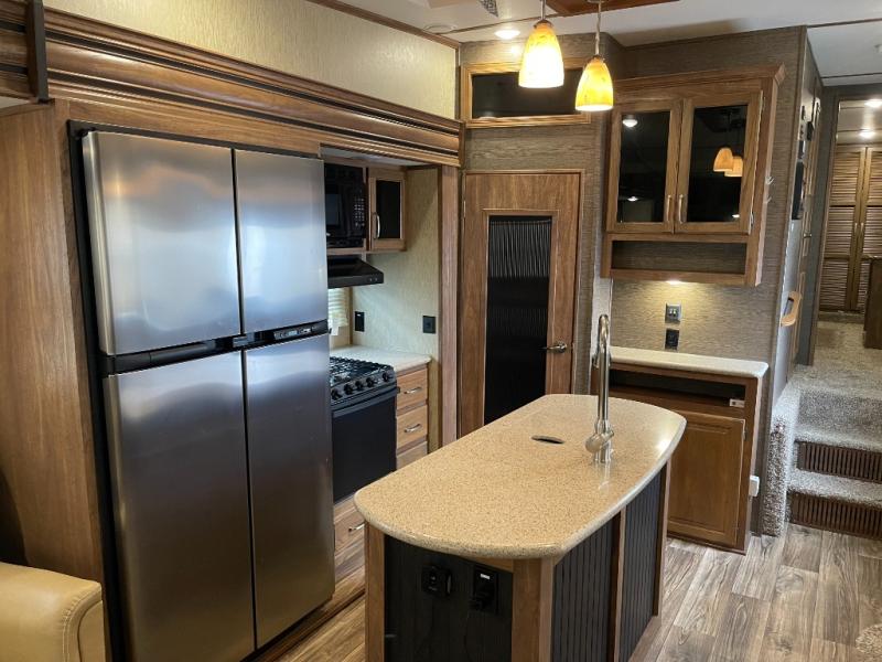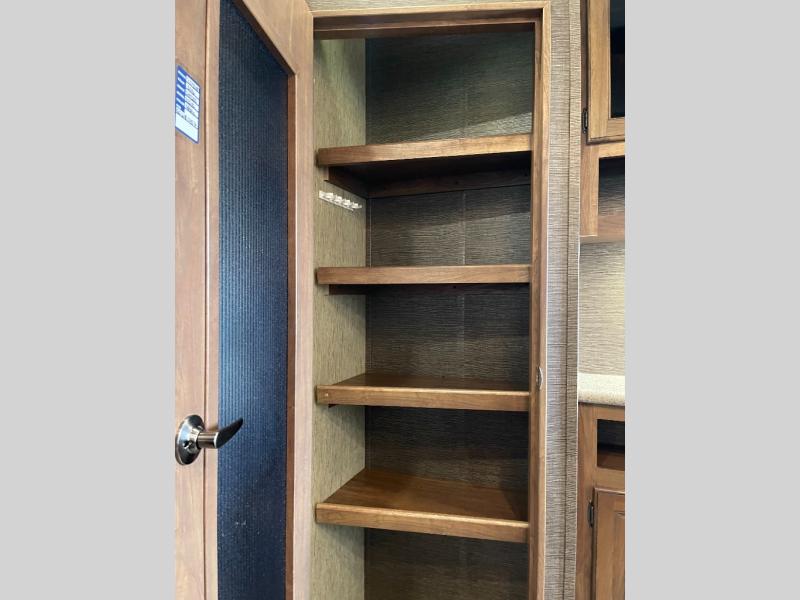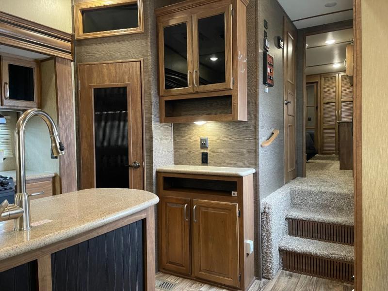 Gorgeous RV! 3 Slides, Outdoor Kitchen, King BedAs you enter notice a curio cabinet and pantry straight ahead along the interior living room wall. A nice kitchen island is off set and provides a large sink, plus added food prep space.