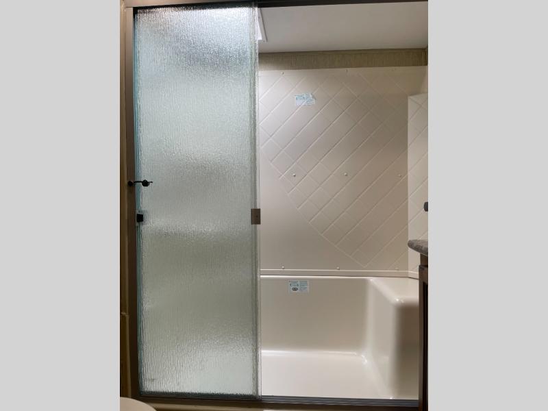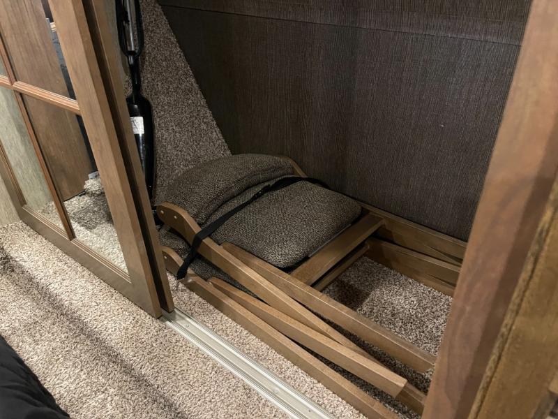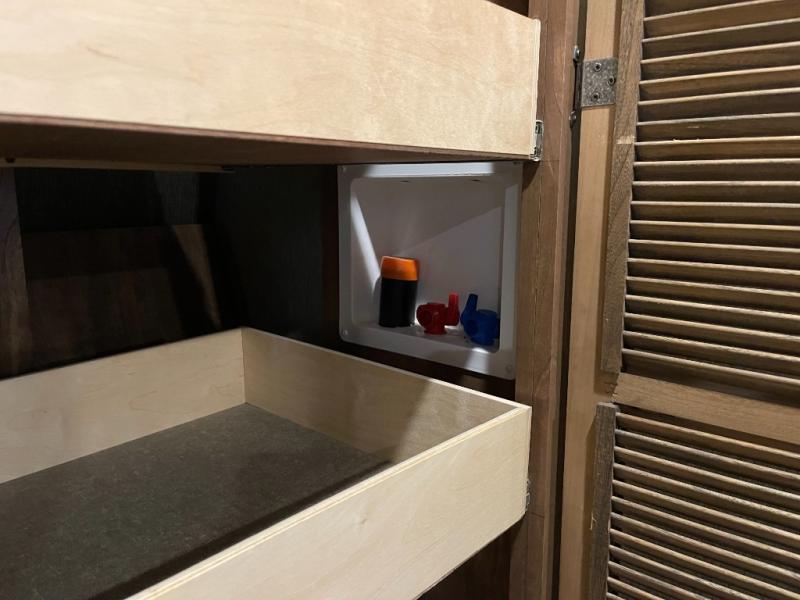 In the bedroom you will enjoy a great nights rest on the king bed provided which slides out giving you plenty of space to move around. There is additional storage above the bed, in the dresser opposite the bed, and all across the front wall giving you ample space to store all of your things.