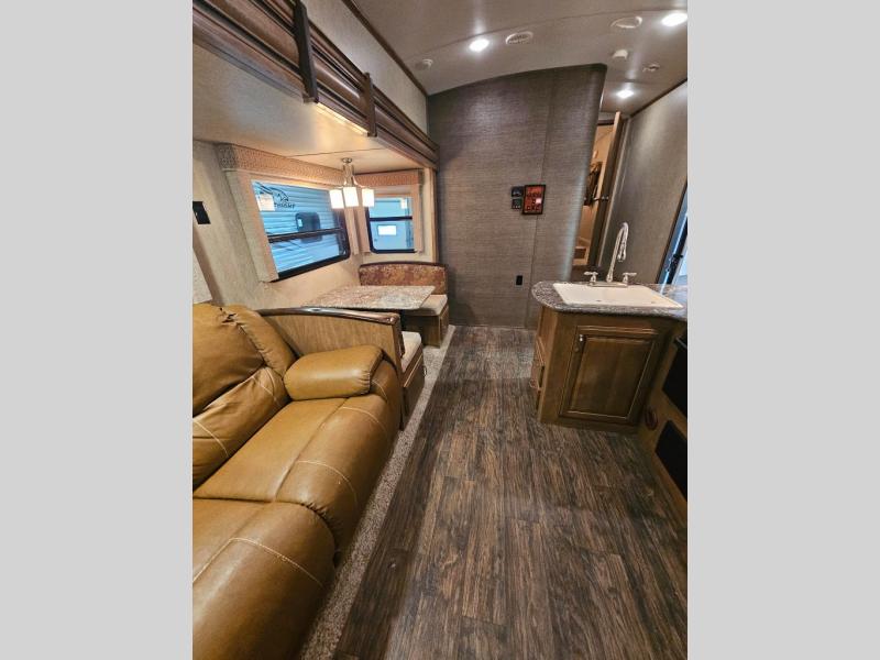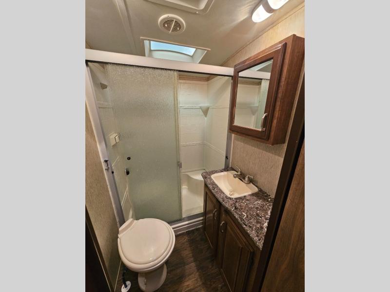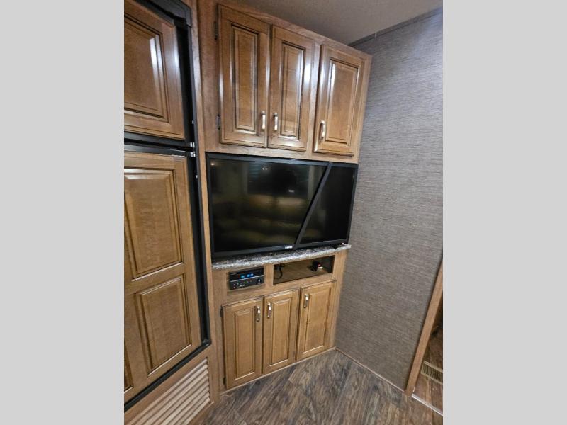 Opposite the door side find a slide out booth dinette and tri-fold sofa sleeper with storage above. A corner entertainment center is across from the sofa and can easily be viewed from any seating in the room.