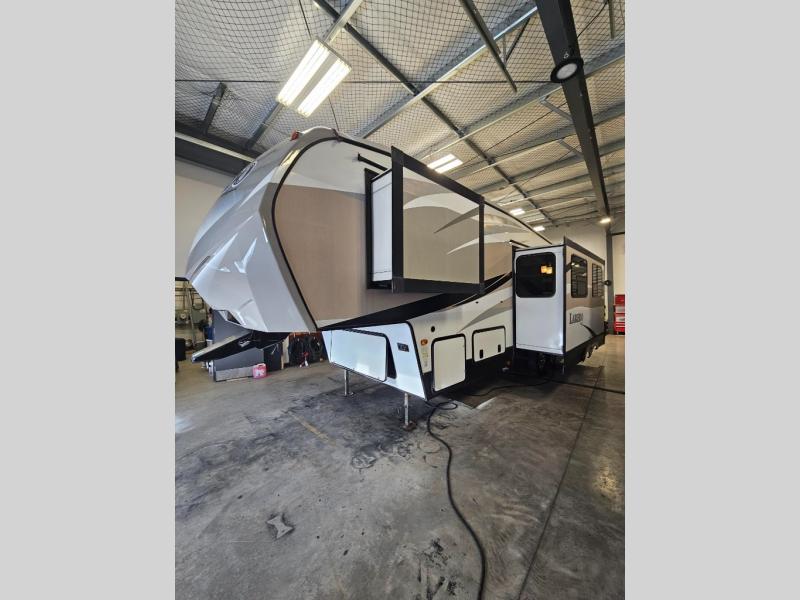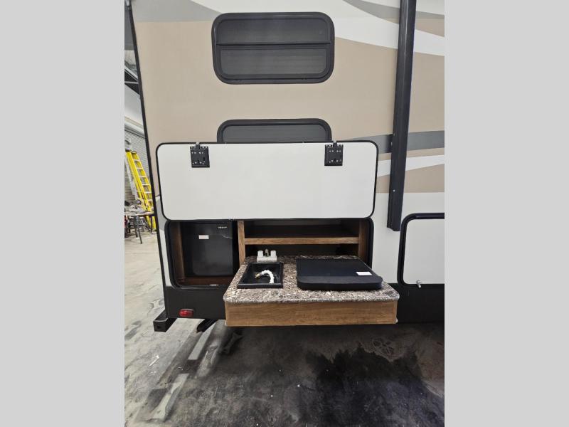 Camp with the whole gang in this Keystone Laredo Super Lite fifth wheel model 285SBH. This unit offers a private bunk room with double bed bunks, dual slide outs which create a spacious floor plan layout. and an outdoor kitchen.