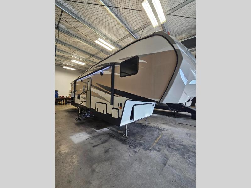 On the outside there is also no shortage of storage space with a large front pass-through compartment, and exterior storage beneath the double bunk area on either side of the pull-out camp kitchen. This too is a great features for those who love to cook and dine outside. You will find the bumper mount grill a handy convenience, as well as the pull out single sink, and two burner cook-top, plus so much more!