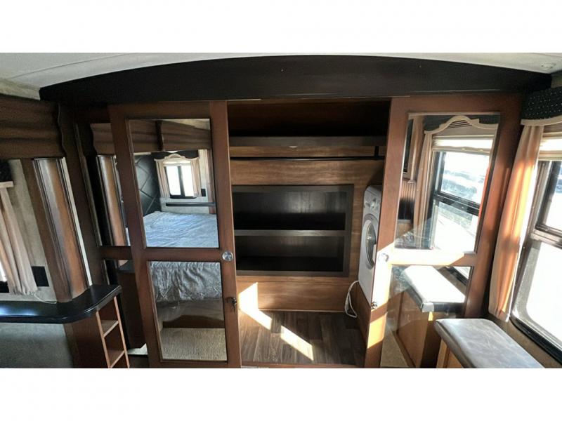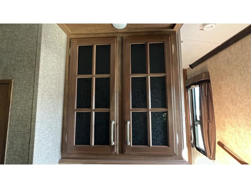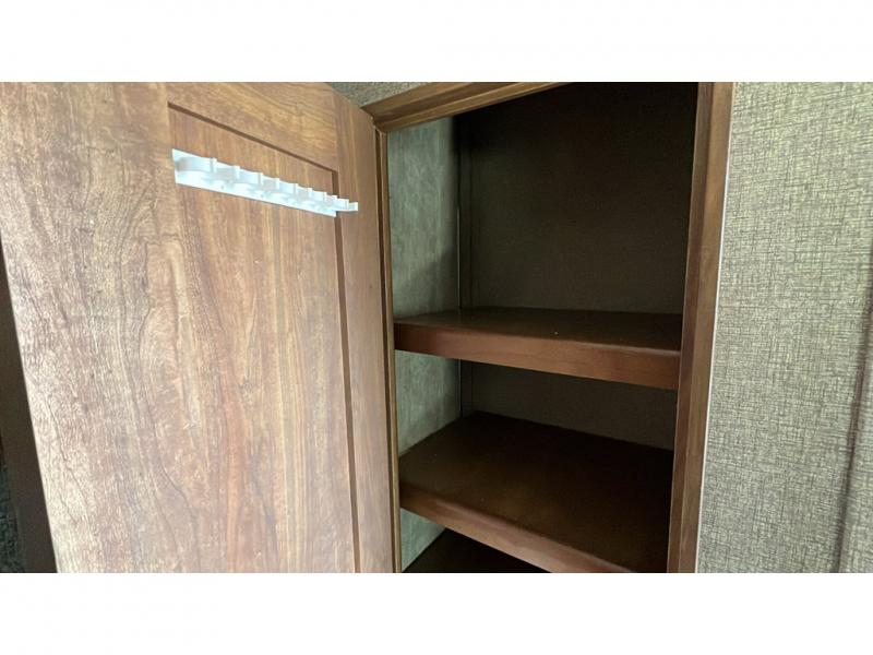 Along the rear wall of the living area you will find a full wall entertainment center and storage. There is a flat screen TV to enjoy and an optional electric fireplace can be added for those cool nights when you just want to hang out inside.